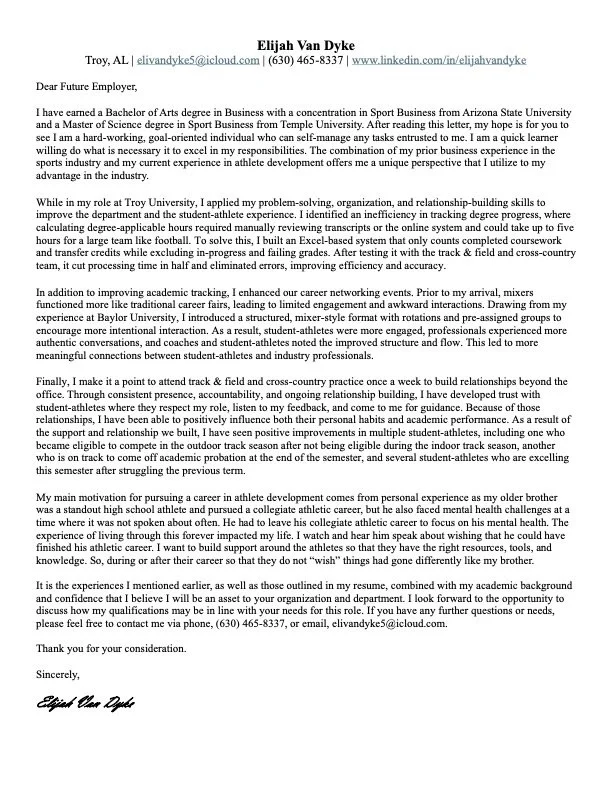 My name is Elijah Van Dyke and I hold a Bachelor of Arts degree in Business with a concentration in Sports Business from Arizona State University and a Master of Science degree in Sport Business from Temple University.